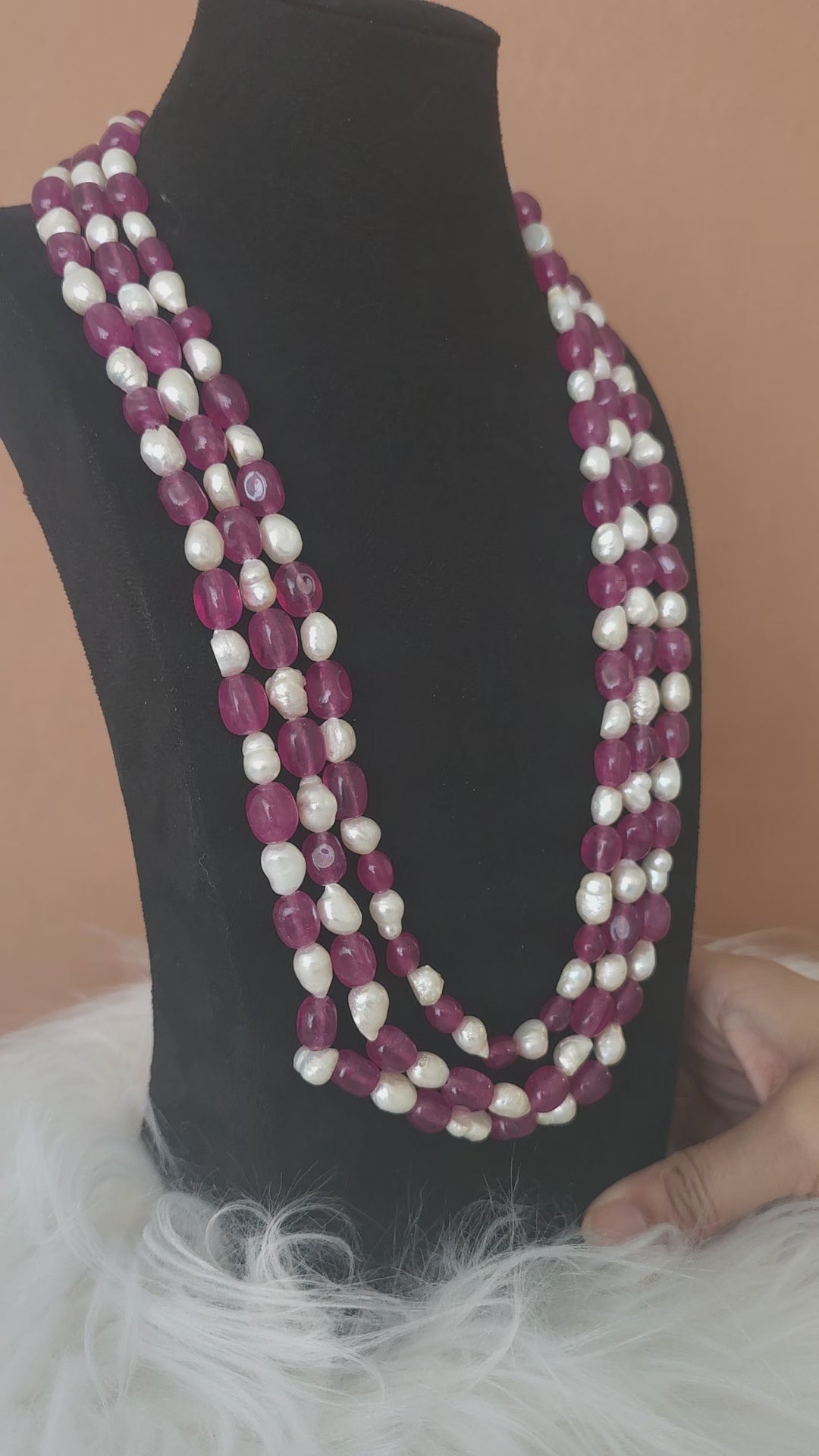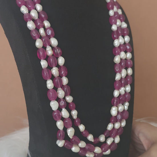 Elevate your collection with the Lulu and Ruby Long Haar, a regal statement crafted from high-quality real pearls paired with exquisite ruby awazey accents. This versatile piece offers the choice of three or four customizable strands, allowing you to tailor its length and presence to your preference.