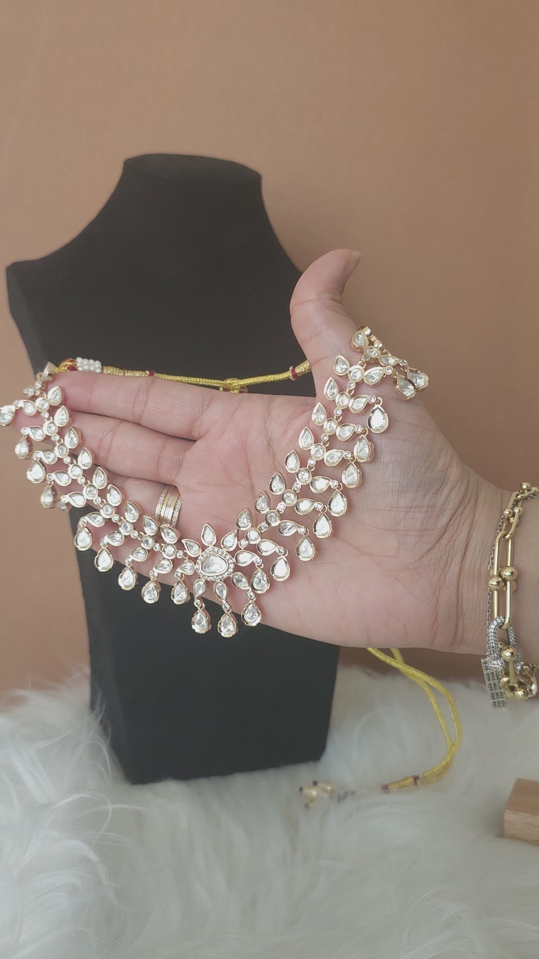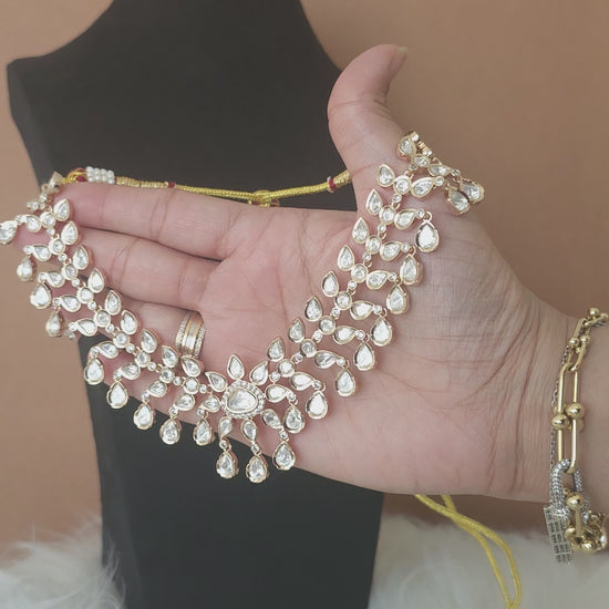 Elevate your festive look with the Mira Moissanite set, featuring expertly crafted big hanging earrings adorned with radiant moissanite stones. Finished in a warm rose gold polish, each earring highlights elegant droplets that catch the light beautifully, offering a sophisticated sparkle. Perfect for special occasions, these statement earrings combine timeless brilliance with contemporary design to enhance your ensemble with expert artistry.